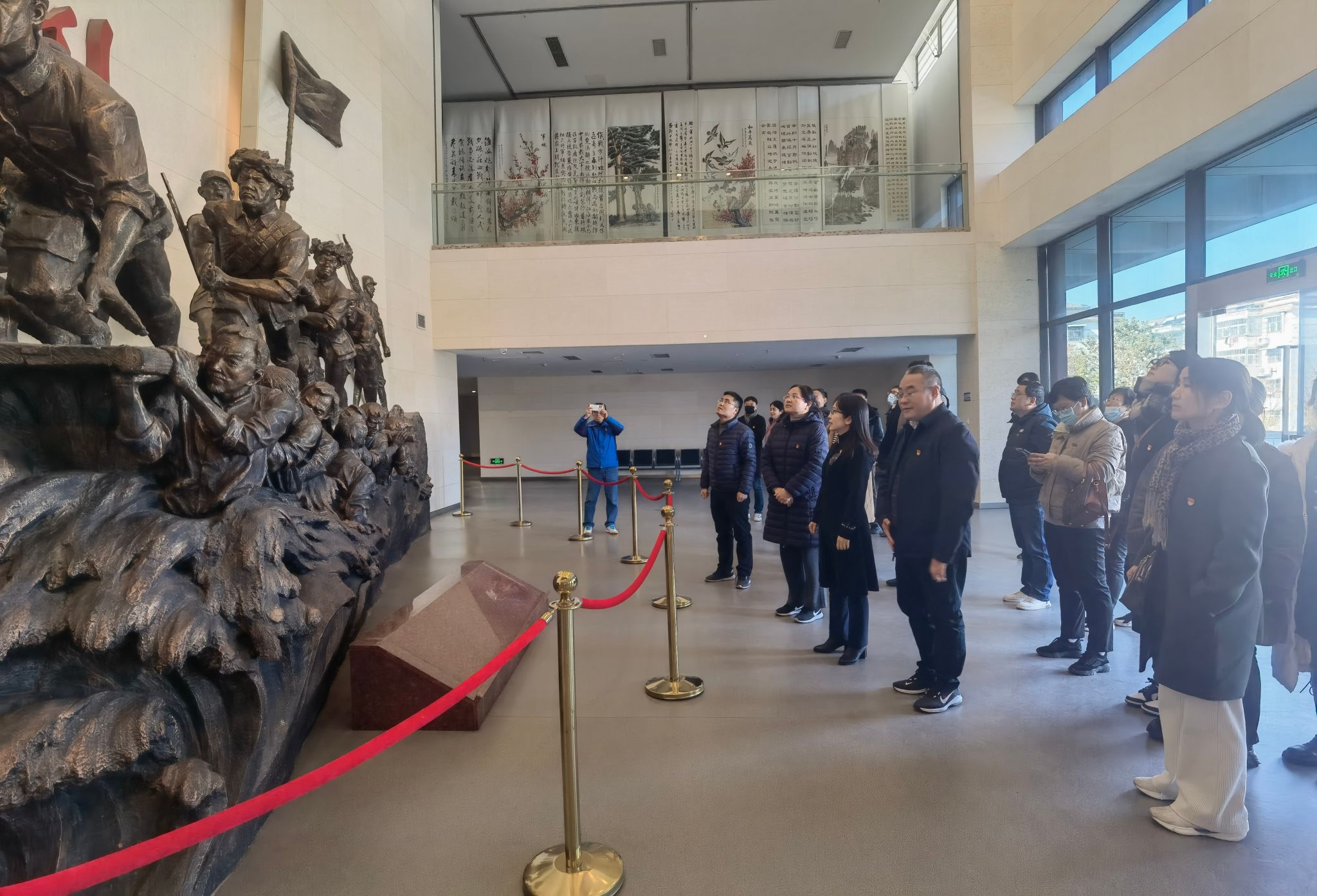 大家来到淮海战役碾庄圩战斗纪念馆,先后参观了纪念馆、纪念碑、碑林、英烈湖等。大家怀着崇敬的心情瞻仰了“人民的胜利”主题雕塑,通过“胜利之势—剑指淮海”“胜利之战—淮海首捷”“胜利之本—万众支前”“战地新姿—美好邳州”等展区的影像图片和文物史料,详细了解碾庄圩战斗的光辉历史和先烈们的革命事迹。在纪念碑前,全体党员集体肃立默哀并向烈士们敬献鲜花,面对党旗庄严高举右拳,重温入党誓词、重忆入党经历、重问入党初心。