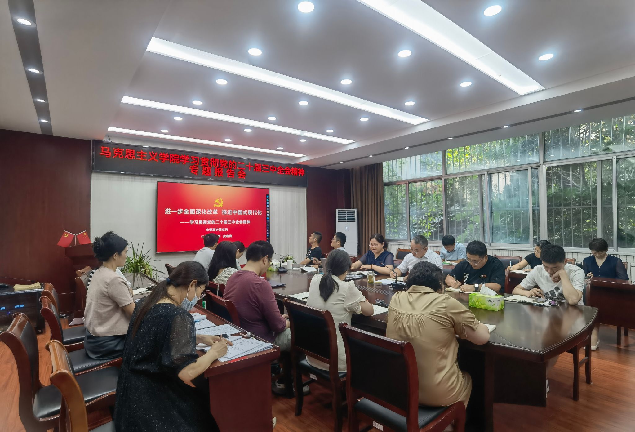 为深入学习领会党的二十届三中全会精神,扎实推动学习宣传贯彻工作,按照学校党委部署要求,9月18日下午,我院在会议室举行学习贯彻党的二十届三中全会精神宣讲报告会,学院全体教职工参加报告会。校宣讲团成员、我院院长沈春梅作宣讲报告,报告会由党总支书记韩振响主持。