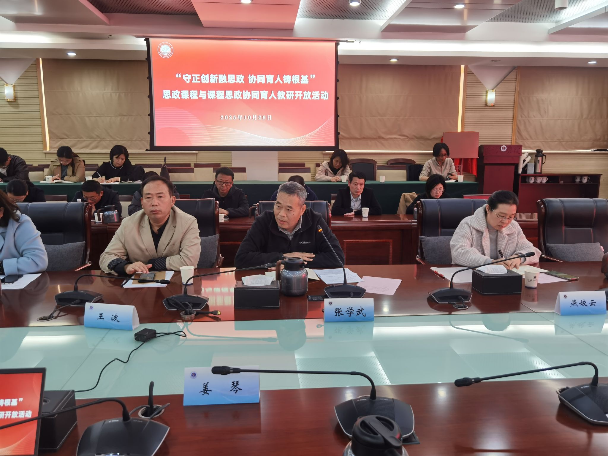 为深入贯彻落实立德树人根本任务,扎实推进思政课程与课程思政同向同行、协同育人,10月29日下午,“守正创新融思政,协同育人铸根基”思政课程与课程思政协同育人教研开放活动在会议中心东海厅举行。活动由我院具体承办,教师教学发展中心协办。校党委常委、党委宣传部部长王波,校教学督导组副组长张学武,我院院长沈春梅,教学质量管理处副处长燕姣云、教务处副处长祝春水,以及全校思政课教师、专业课程骨干教师、院系教学督导等共同参与了本次活动。活动由沈春梅主持。