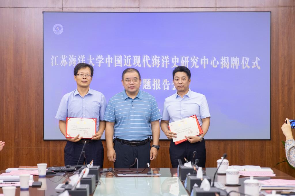 社会科学处处长魏范青宣读同意成立江苏海洋大学中国近现代海洋史研究中心的批复。校党委书记王自力、党委副书记史顺良分别宣读研究中心组成人员名单、颁发聘书并共同为研究中心揭牌。