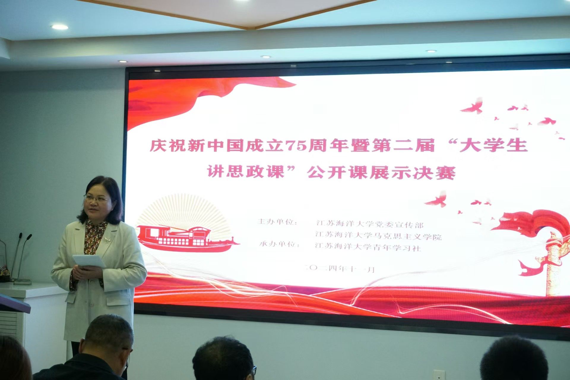 11月15日下午,庆祝新中国成立75周年暨第二届“大学生讲思政课”公开课展示活动在苍梧校区文渊楼115举行。我院党总支书记韩振响、院长沈春梅、校党委宣传部宣传科科长英启琛、我院教授周桂芹、王永强等出席比赛并担任评委,部分同学及我院全体教师观摩了比赛。