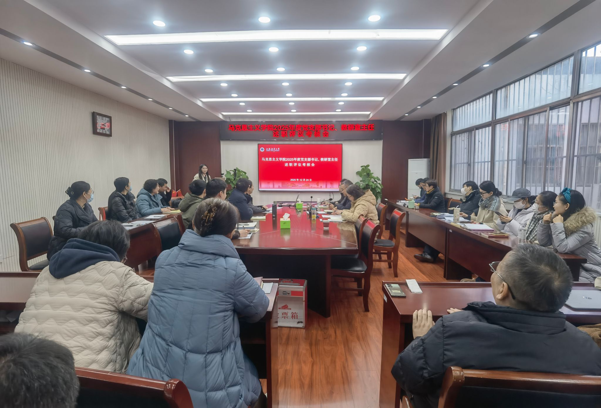 1224午,我院在会议室召开2025年度党支部书记、教研室主任述职评议考核会。会议由院长沈春梅主持,全体教职工参加会议。