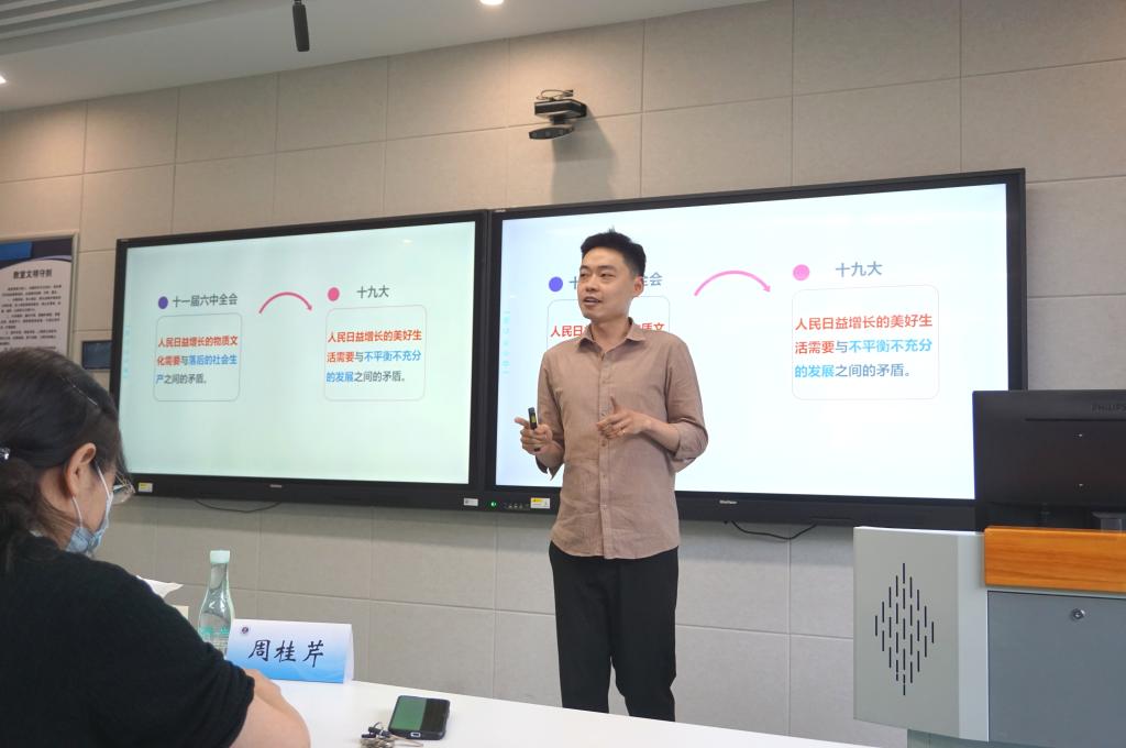 比赛中,于涛、刘洋、高飞、王桢、王泉月、倪念念等6位教师分别以“爱国主义”“抗疫的认识之路”“初识唯物辩证法”“路虽远,行则将至——中国的共同富裕之路”“社会主要矛盾的变化”“孔颜之乐与中国传统文化的基本精神”为题进行了教学展示。他们准备充分、精神饱满、讲解透彻,赢得现场阵阵掌声。经过激烈角逐,倪念念、王泉月两位老师最终摘得比赛桂冠。