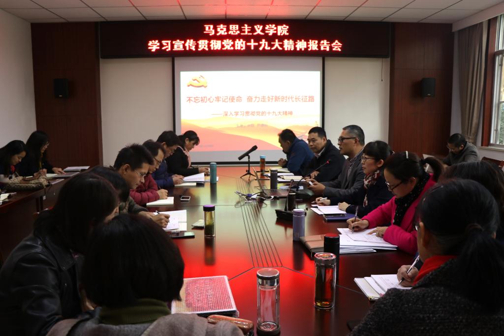 报告会结束以后,金芙蓉做了总结,并对在场的全体教职工提出了要求:作为马克思主义学院的一份子,学习、研究、宣传、贯彻十九大精神是当前和今后我们很长一段时间的一项重要的政治任务,马克思主义学院的老师必须真正学懂、弄通、做实党的十九大精神,将党的十九大精神传达到课堂中去,推动党的十九大精神“进教材、进课堂、进头脑”,争做学习、研究、阐述、宣传十九大精神的排头兵。