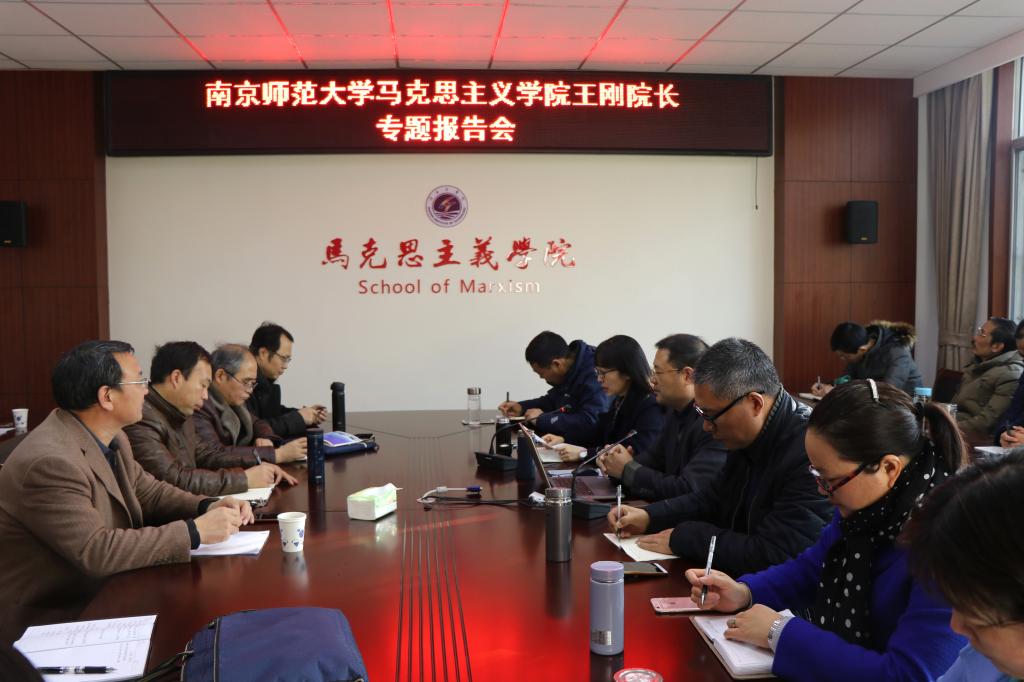 为进一步推进我校思想政治理论课改革,切实提高思想政治理论课教学实效,11月25日在马克思主义学院会议室,南京师范大学马克思主义学院院长、博士生导师王刚教授应邀为我校全体思政课教师作了《提升高校思政课教育教学实效性的思考》专题报告。报告会由我院党总支书记金芙蓉主持。
