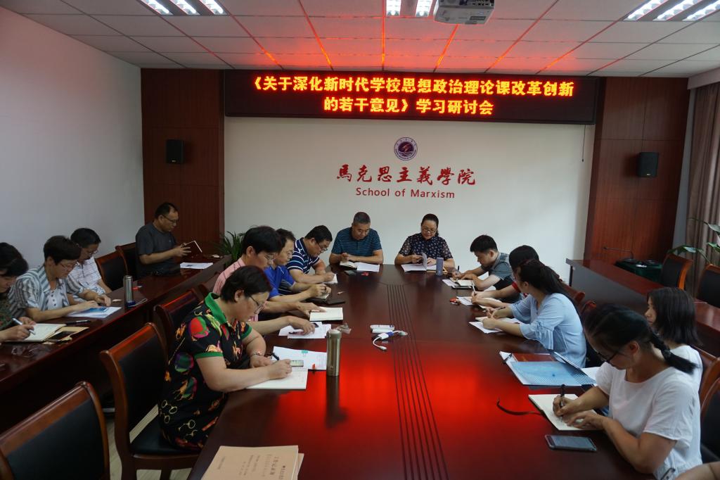 8月28日下午,我院在学院会议室围绕中共中央办公厅国务院办公厅印发的《关于深化新时代学校思想政治理论课改革创新的若干意见》进行学习研讨。会议由学院党总支书记张学武主持,学院全体教师参加会议。