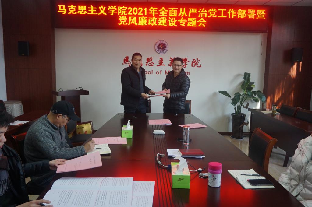 会上,根据学院党风廉政建设责任网络,张学武代表学院党总支与教工党支部书记、党政办公室主任,沈春梅代表院行政与教学办主任、教研室主任分别签订了党风廉政建设责任状。