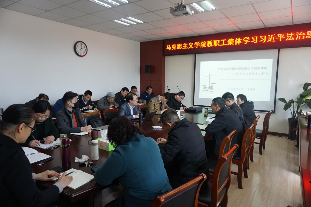 3月24日下午,马克思主义学院教职工集体学习研讨习近平法治思想。文法学院副教授吴建国博士以“全面依法治国的理论基础与制度建构——习近平法治思想要义解读”为题作辅导报告,研讨会由马克思主义学院党总支书记张学武主持。