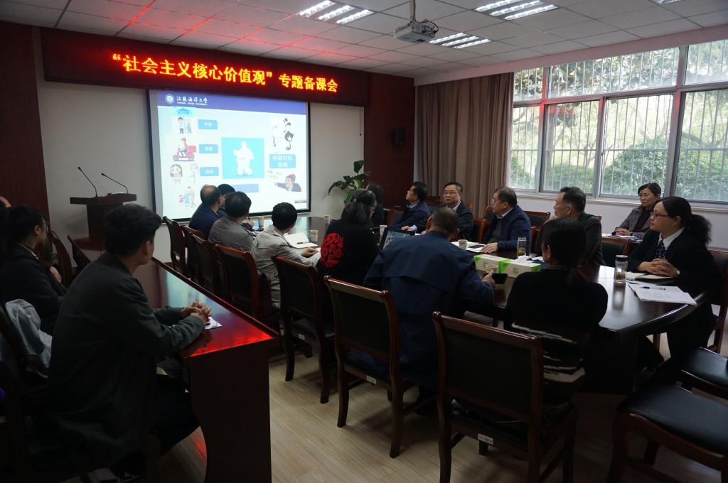 为深入贯彻落实《江苏海洋大学2021年大学生社会主义核心价值观教育工作方案》,提升社会主义核心价值观专题教学水平,增强课程感染力和亲和力,4月28日下午,“社会主义核心价值观”专题备课会在我院举行。校党委书记王自力、党委副书记史顺良、副校长严云洋、组织部部长纪延光、宣传部部长杨雪英以及马克思主义学院骨干教师等社会主义核心价值观宣讲团成员参加了备课会。备课会由宣传部部长杨雪英主持。