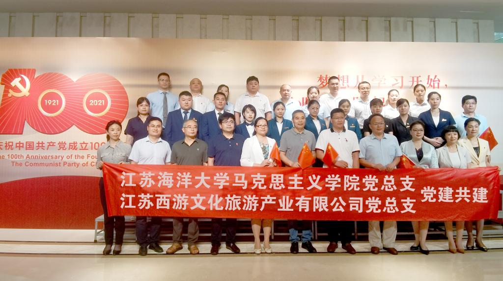 7月13日上午,江苏西游文旅党总支与马克思主义学院党总支党史学习教育共建活动在西游文旅海州湾会议中心“E起学习”工作室举行。西游文旅党总支书记张贵新、江苏海洋大学马克思主义学院党总支书记张学武、院长沈春梅及西游文旅各权属党支部书记及党员代表、江苏海洋大学马克思主义学院教师代表等共计40人参加共建活动。