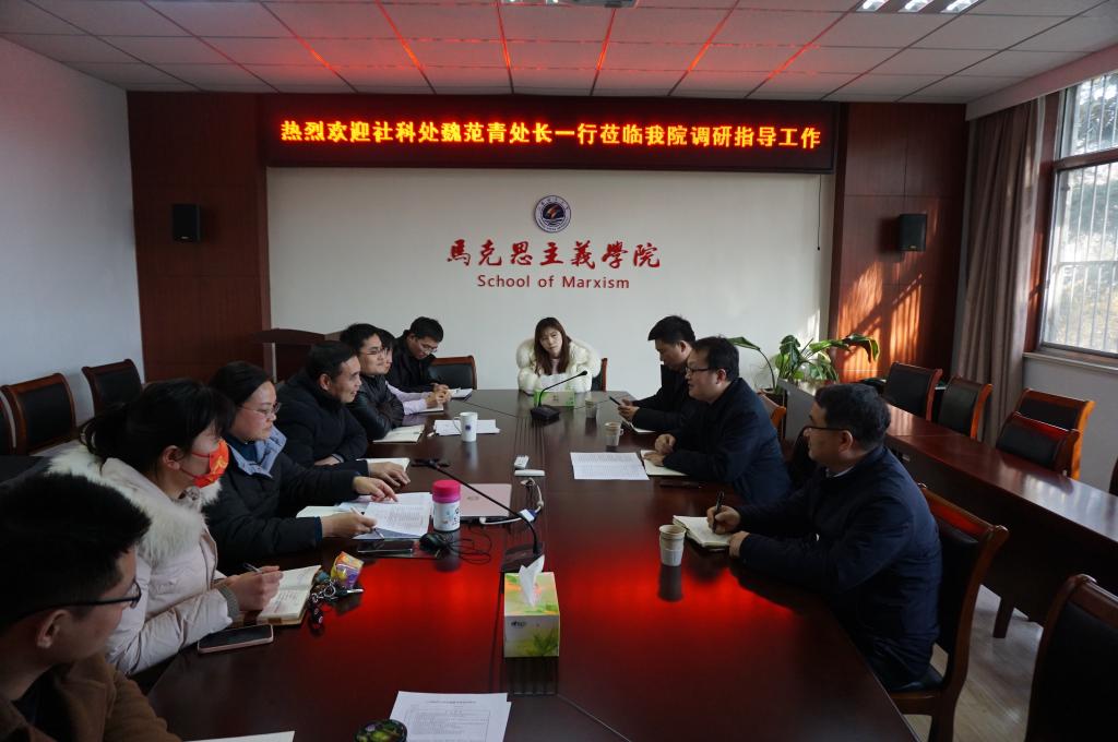 2月23日下午,社科处处长魏范青、副处长赵桂、科长王博一行到我院调研指导工作。我院党总支书记张学武,院长沈春梅,副院长崔家新,以及部分青年教师参加了座谈交流。会议由我院党总支书记张学武主持。