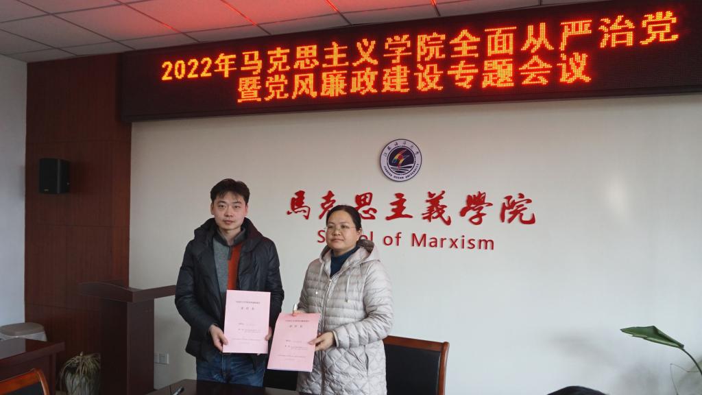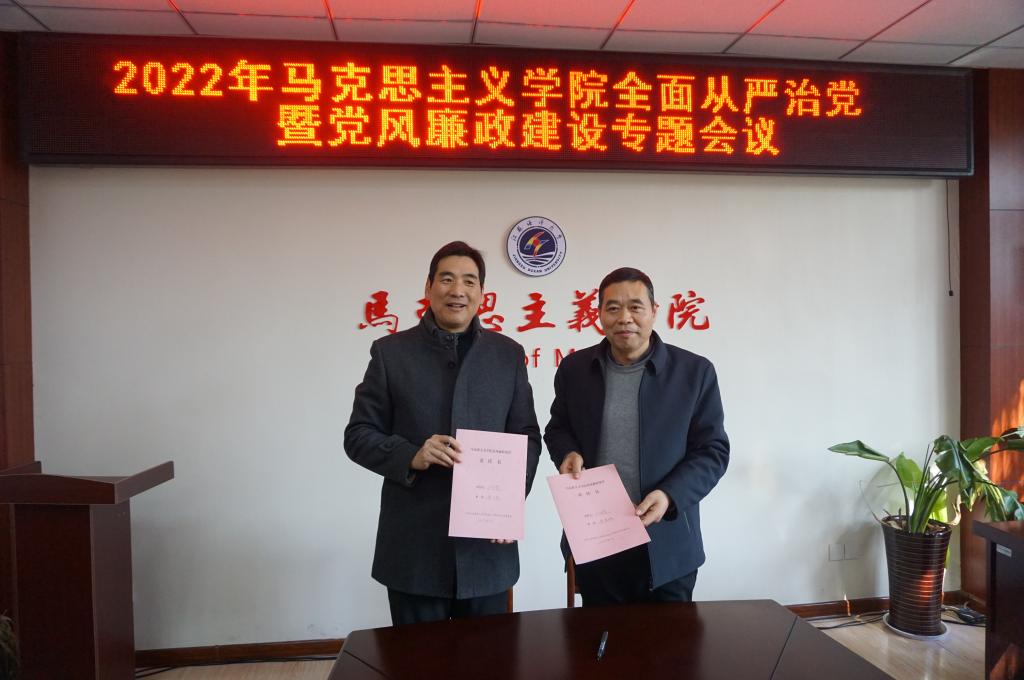 最后,张学武代表学院党总支与教工党支部书记、党政办公室主任签订了党风廉政建设责任书,与全体参会人员签订了意识形态工作责任书;沈春梅代表院行政与教学办主任、教研室主任分别签订了党风廉政建设责任书。