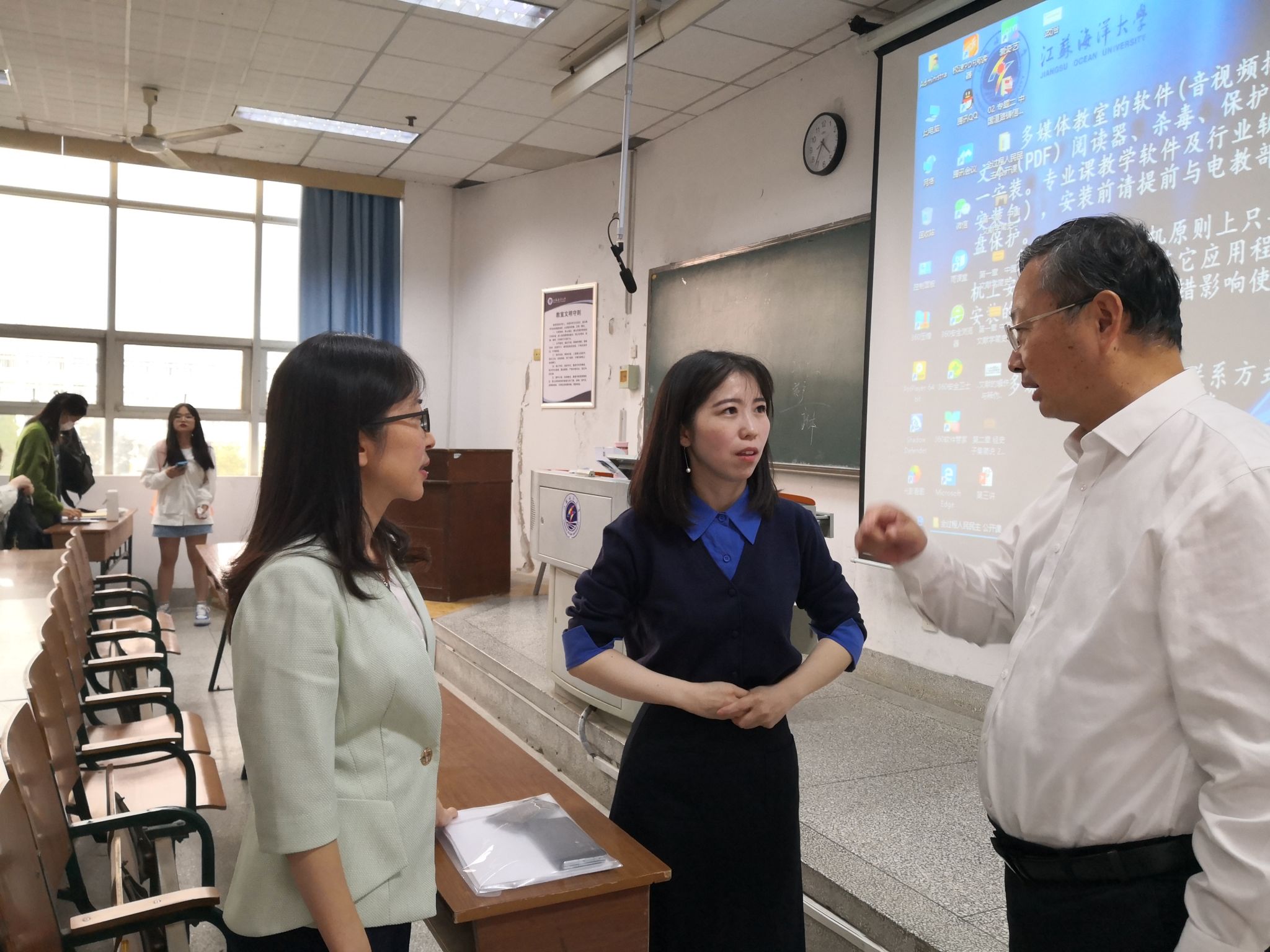 10月18日上午,许峰、金芙蓉来到文通楼204教室,与2022级网络、软嵌专业的学生共同听了《毛泽东思想和中国特色社会主义理论体系概论》“社会主义初级阶段理论”专题教学,并在课间与主讲教师王泉月深入交流。