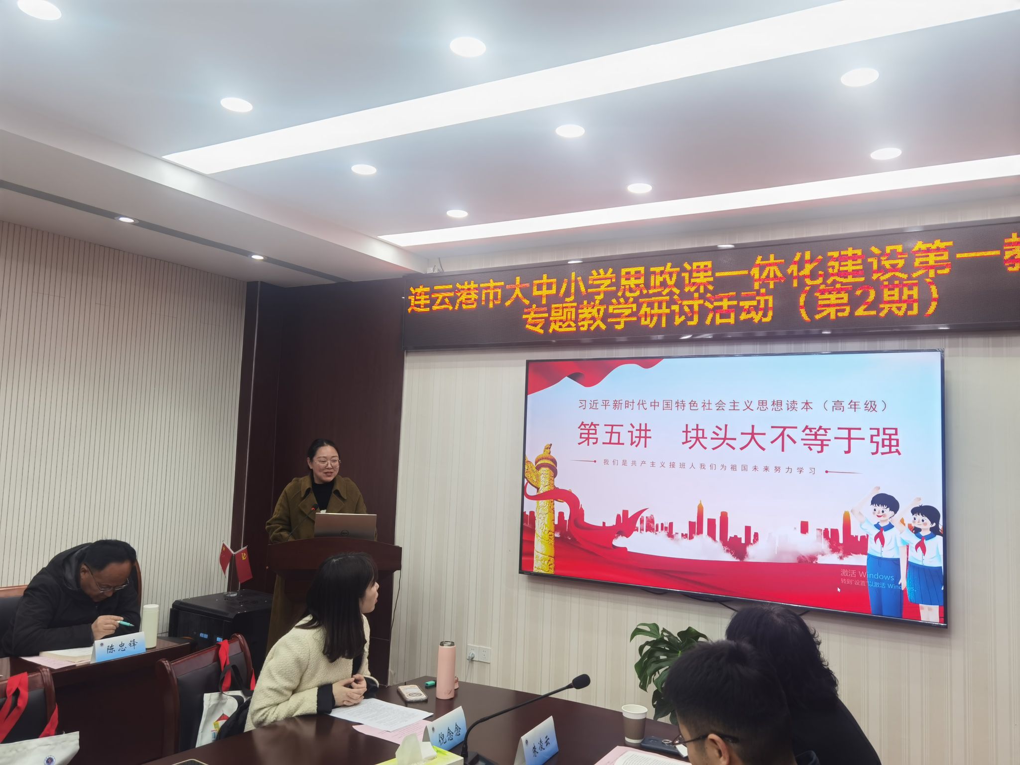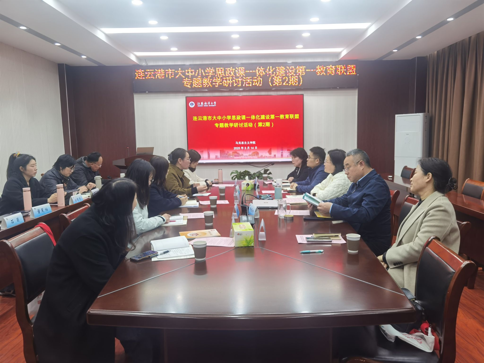 为进一步推动大中小学思政课一体化建设,增进大中小学思政课教师对各学段知识的相互了解,3月14日,第2期连云港市大中小学思政课一体化建设第一教育联盟专题教学研讨活动在我院112会议室举行。我院院长、连云港市大中小学思政课一体化指导委员会专家指导组组长沈春梅,我院党总支书记韩振响,连云港市苍梧小学党委书记戴咏芳,我院副院长崔家新,我院习近平新时代中国特色社会主义思想概论教研室教师,连云港市苍梧小学思政课教师代表参加活动,活动由我院院长沈春梅主持。