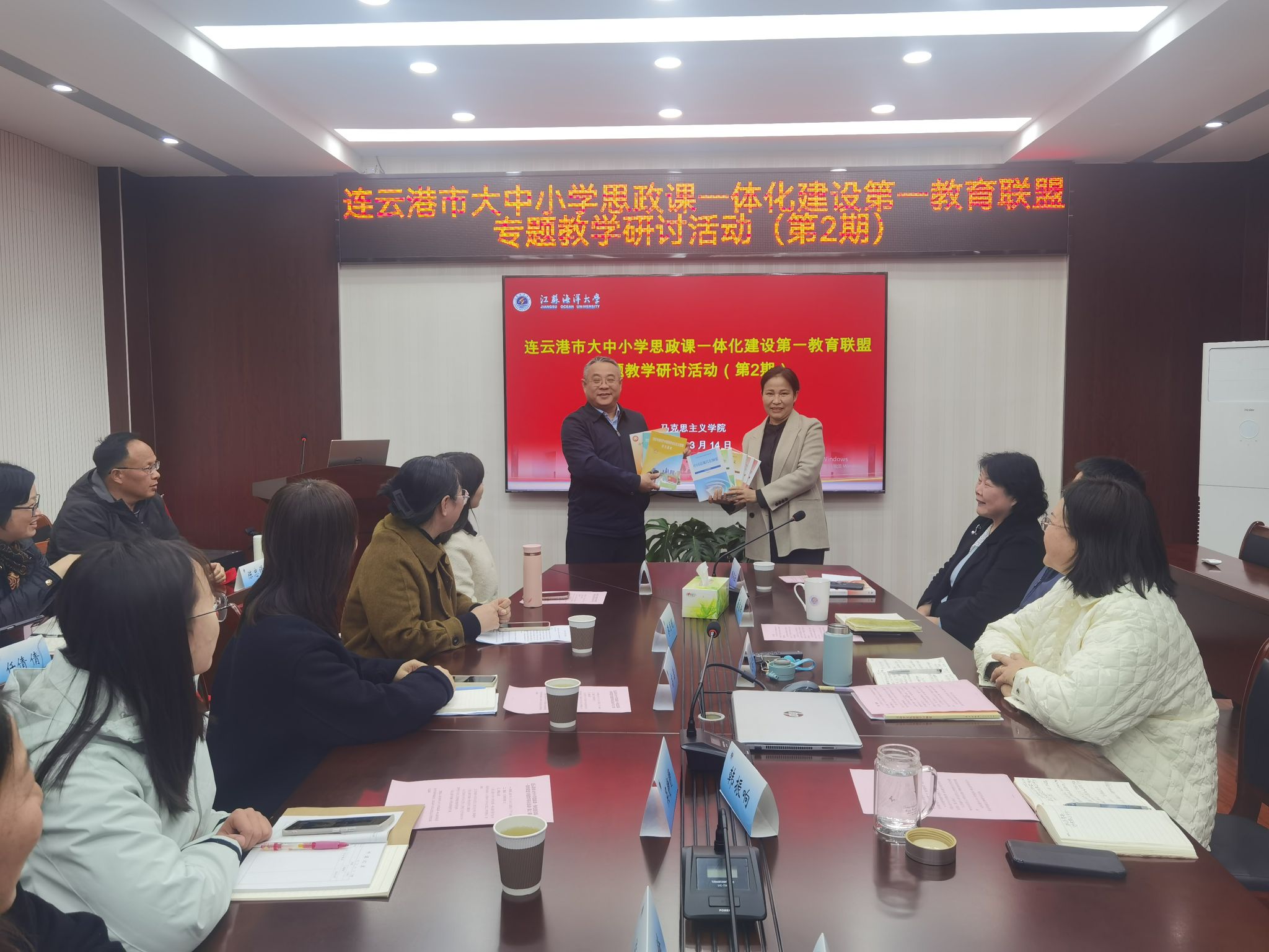 会上,韩振响和戴咏芳分别代表双方学校互赠思政课教材。