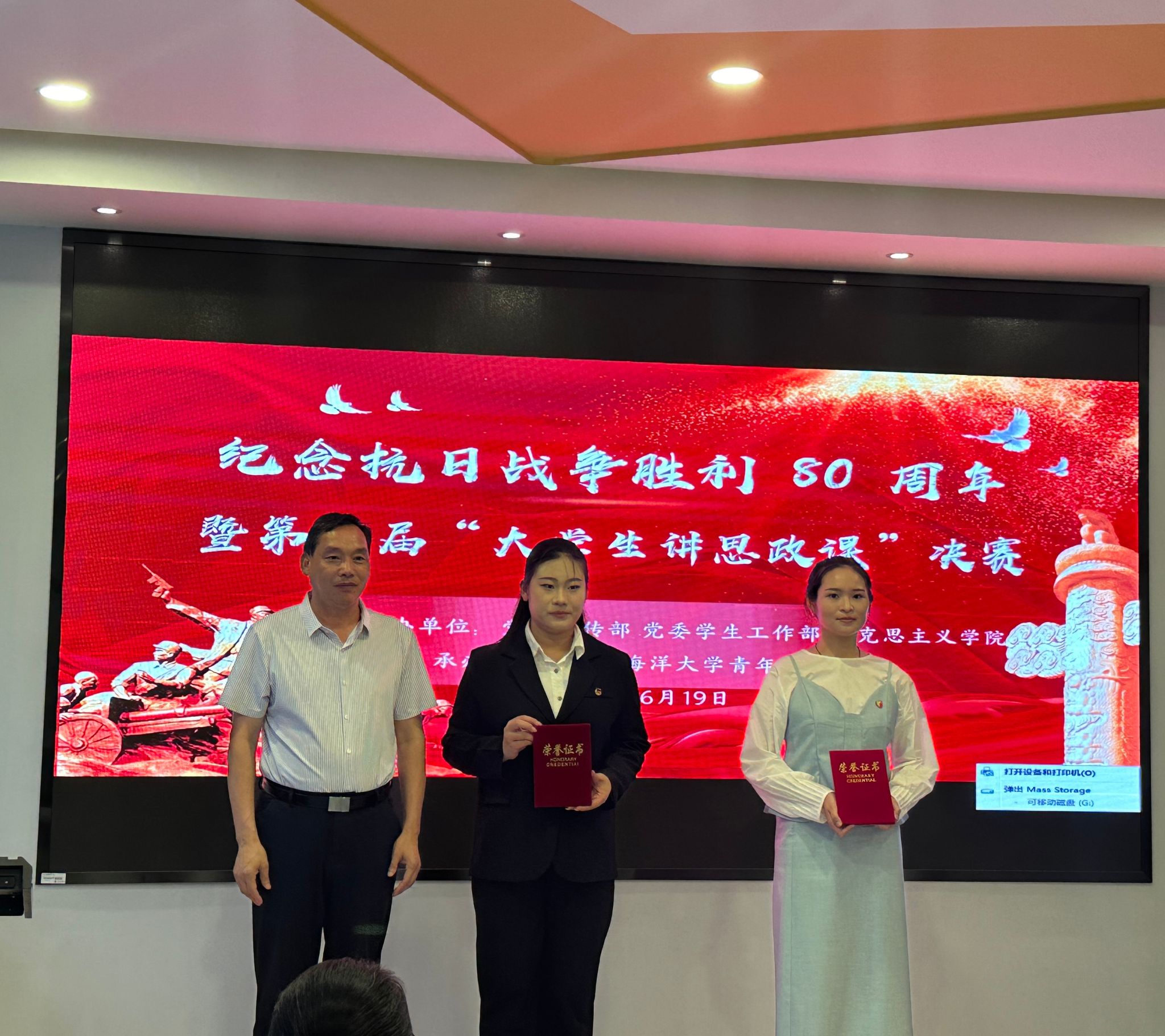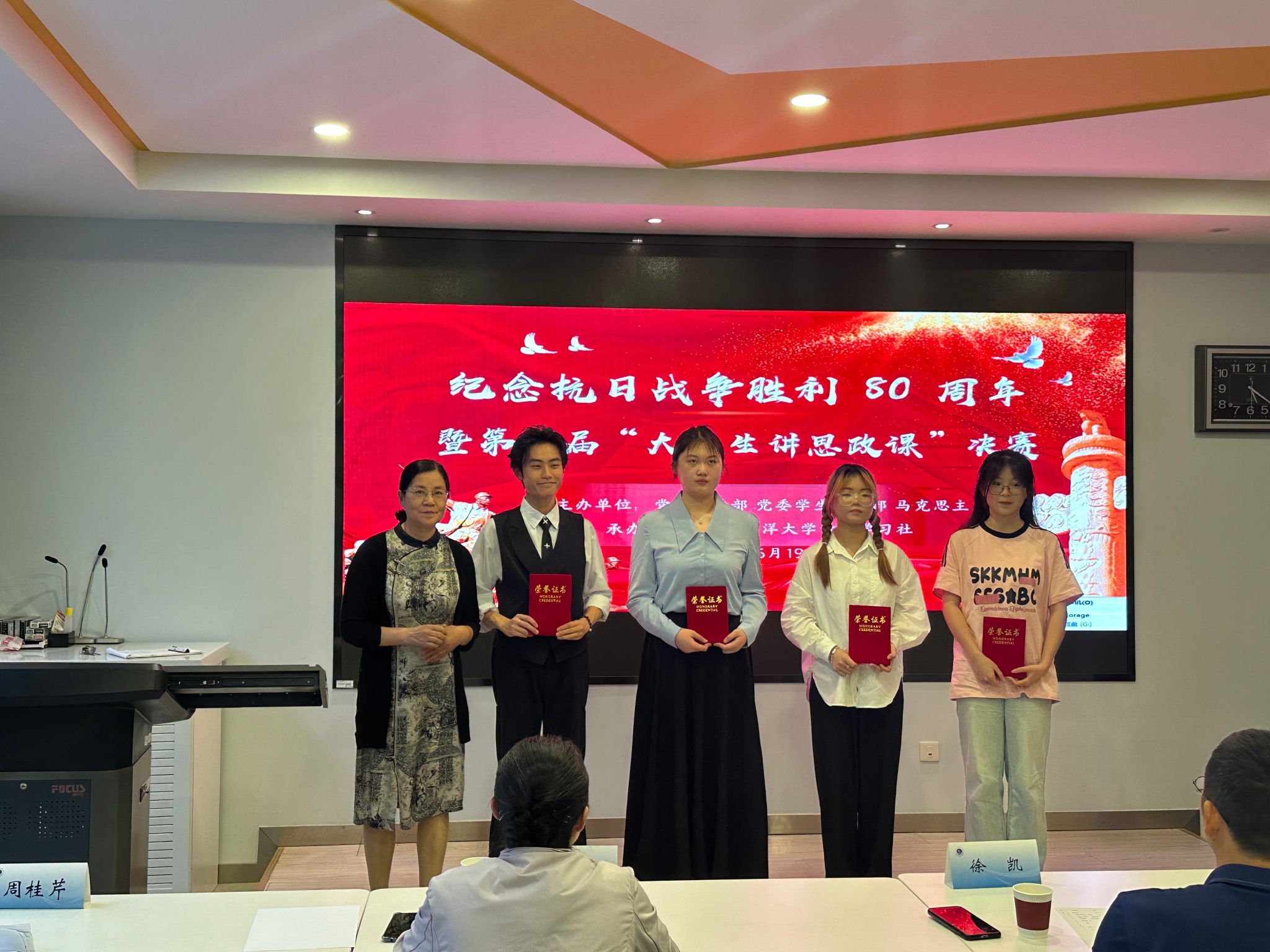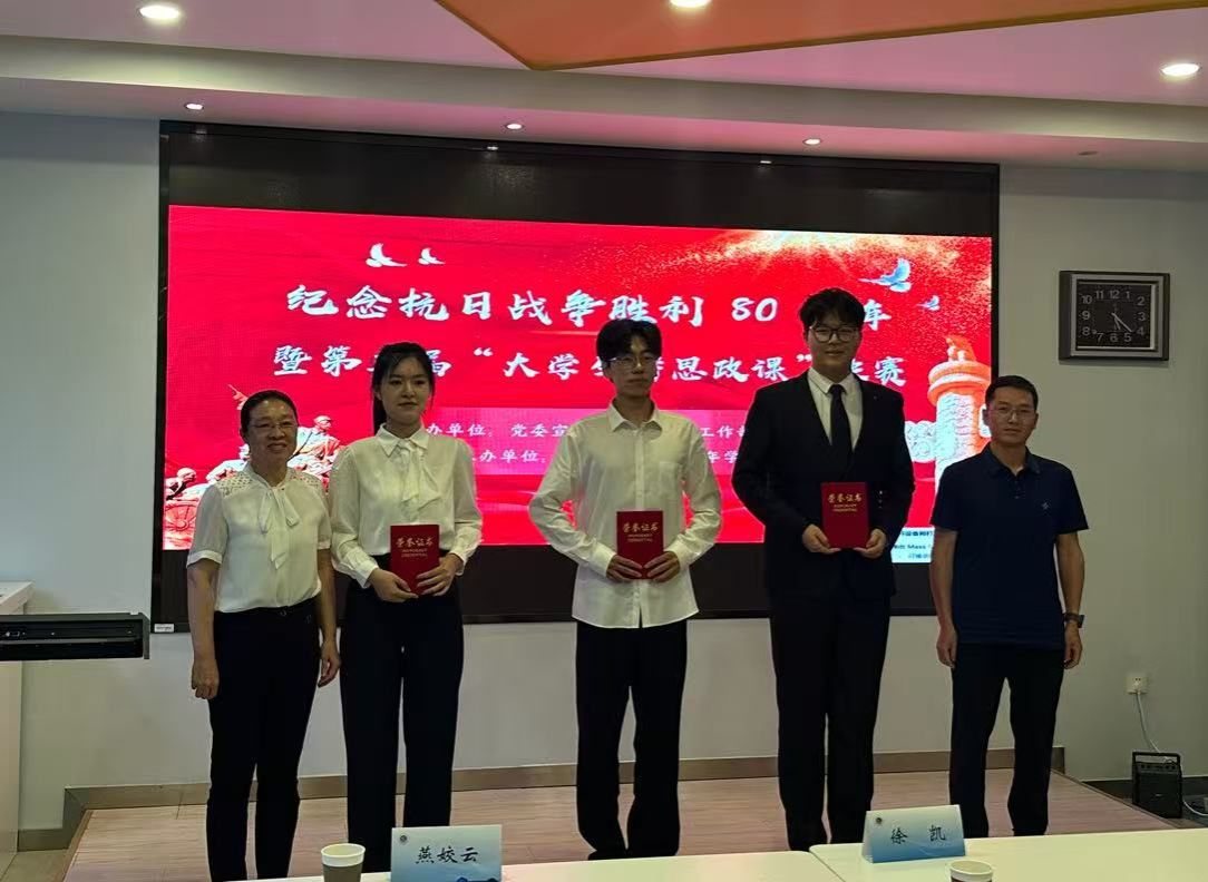 2025年是中国人民抗日战争暨世界反法西斯战争胜利80周年。为深入学习贯彻习近平新时代中国特色社会主义思想和党的二十届三中全会精神,推动思政课守正创新、内涵式发展,6月19日下午,由党委宣传部、党委学生工作部、马克思主义学院主办,校青年学习社承办的第三届“大学生讲思政课”比赛决赛在文渊楼115教室举行。校人民武装部副部长张志浩、教学质量管理处副处长燕娇云、党委宣传部副部长徐凯、马克思主义学院教授周桂芹、马克思主义学院党总支书记韩振响出席活动并担任评委。