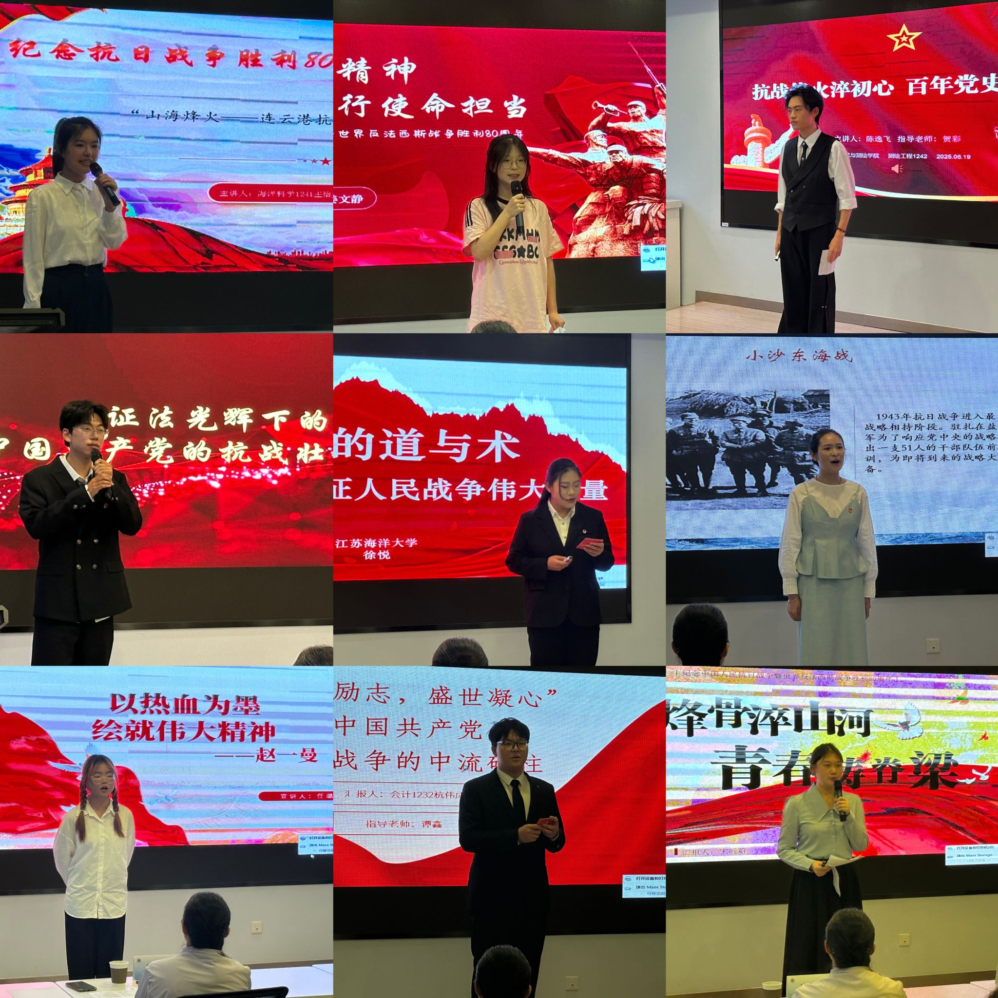 经过初赛的选拔,来自全校各学院的 9位选手晋级决赛,角逐比赛桂冠。参赛选手打破传统思政课讲授模式,将抗战历史与现代视角相结合,用青年人的话语并依托多元呈现方式生动诠释抗战精神。他们围绕抗战精神主题,或是聚焦地道战,解码人民战争的智慧伟力;或是通过与历史对话,擘画新时代青年的信仰与使命;或是从抗战的微观场景切入,多维解构抗战精神内核;或是结合海洋强国使命,展现江海大学子的海洋情怀。选手们精心设计互动环节,引导大家多角度、多层次深刻感悟抗战精神的丰富内涵,令人印象深刻,深受启发。