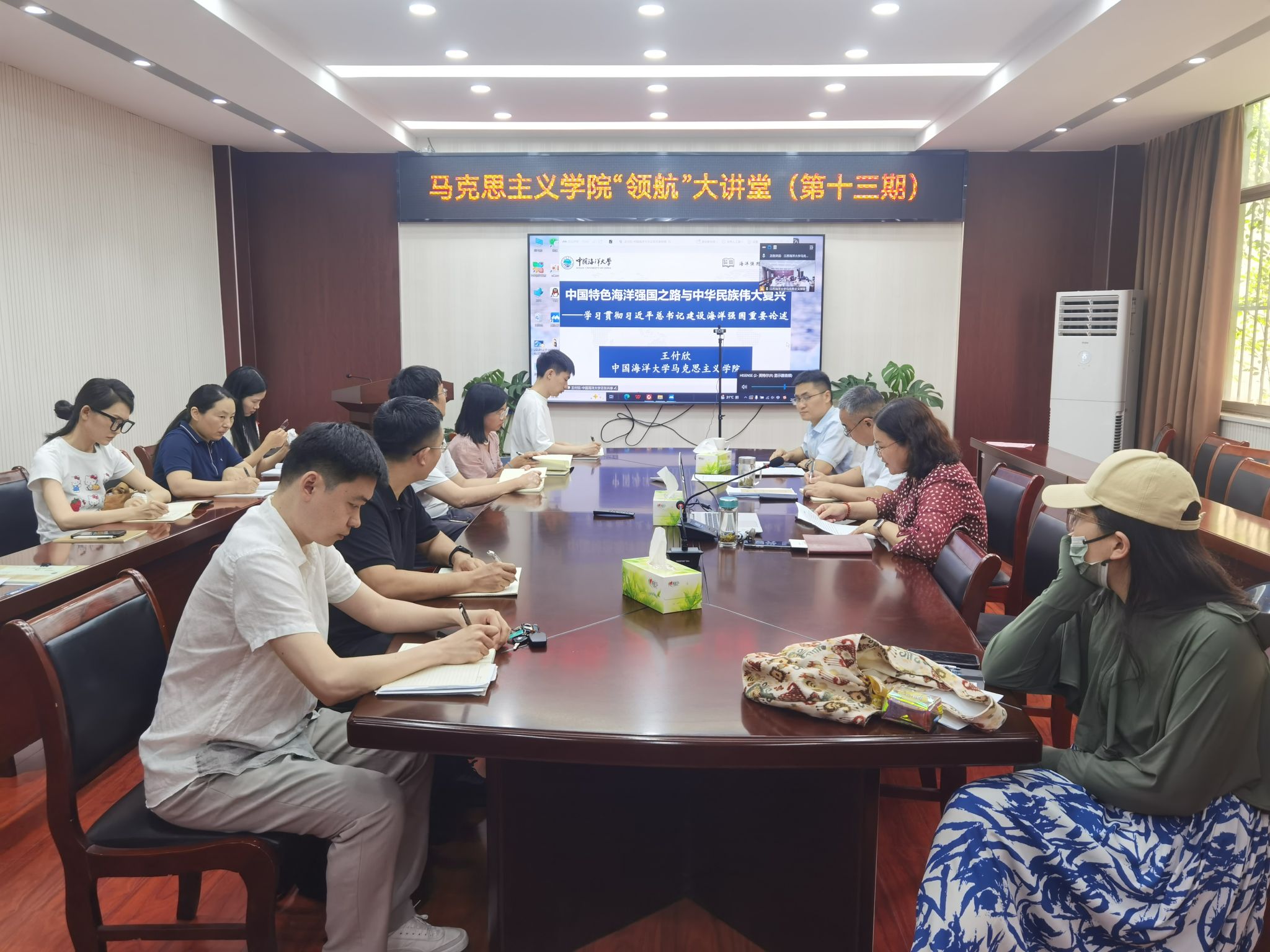 6月25日下午,中国海洋大学当代中国马克思主义研究所所长,马克思主义学院党委副书记、副院长王付欣教授做客我院第十三期“领航”大讲堂,以腾讯会议形式作《中国特色海洋强国之路与中华民族伟大复兴——深入学习习近平总书记关于海洋强国建设的重要论述》报告,报告由我院院长沈春梅主持,学院全体年轻博士参加了报告会。