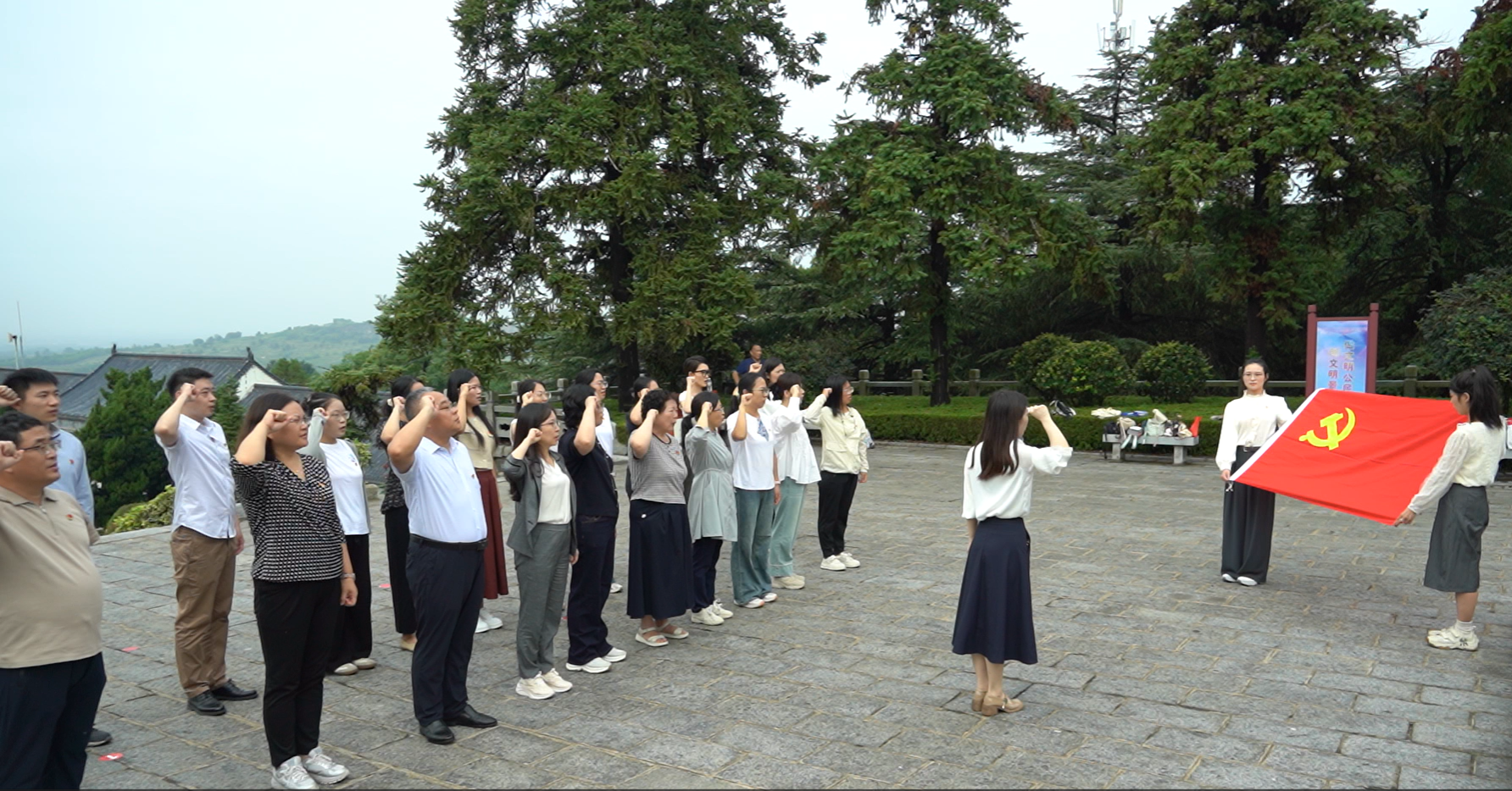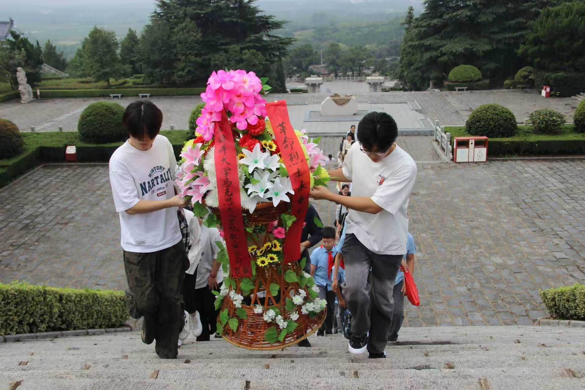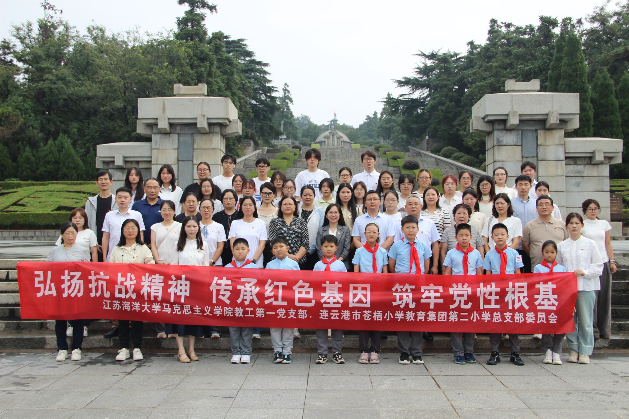 9月13日上午,我院教工第一党支部联合连云港市苍梧小学教育集团第二小学党总支,在赣榆区抗日山烈士陵园举行“大手拉小手 弘扬抗战精神 传承红色基因 筑牢党性根基”主题党日活动。校党委常委、副校长金芙蓉,马克思主义学院党总支书记韩振响、院长沈春梅以及师生党员、学生代表共60余人参加活动。