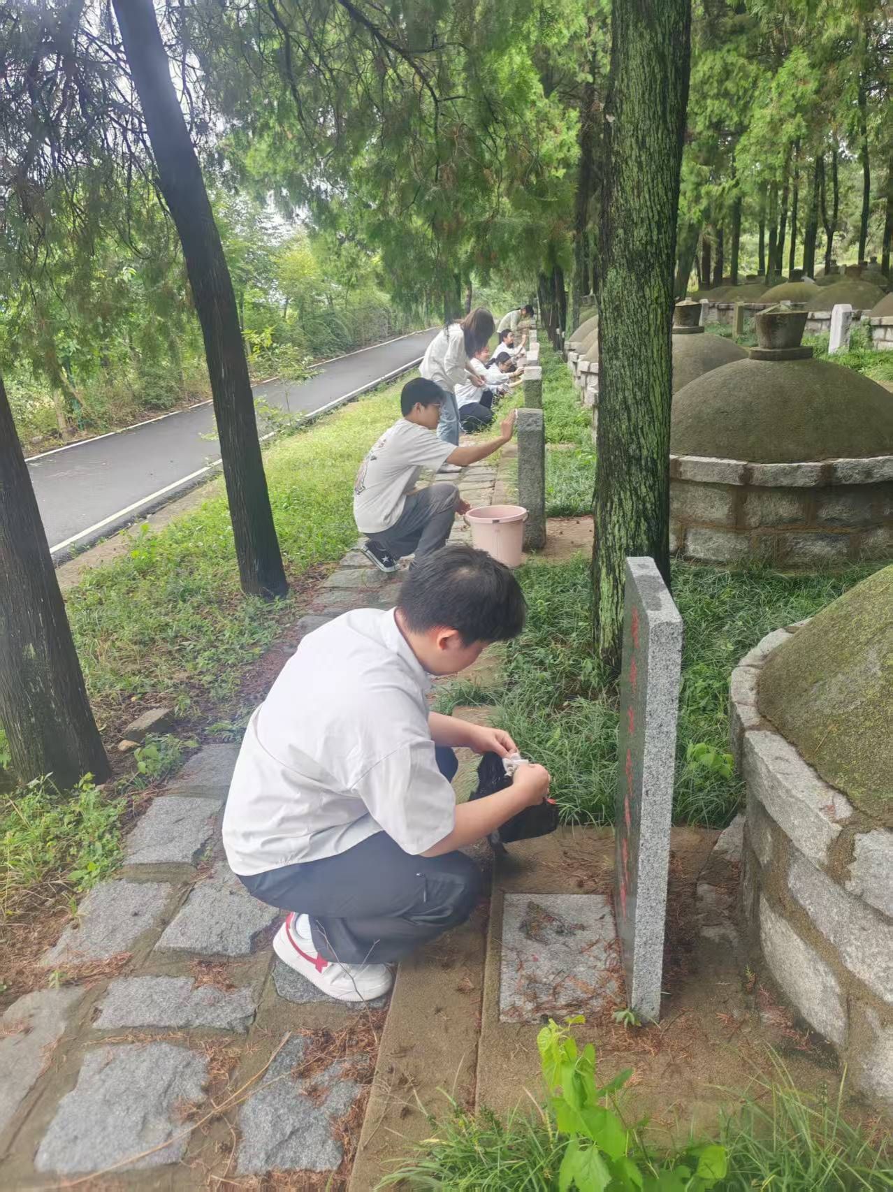活动最后,大学生们带领小学生手持毛笔,为烈士墓碑一笔一画认真描红,以表达对先烈的缅怀敬意。师生们还纷纷对墓碑和纪念设施进行擦拭清理,清扫杂草、垃圾等,用实际行动擦亮历史的记忆,守护英灵安息之地。
