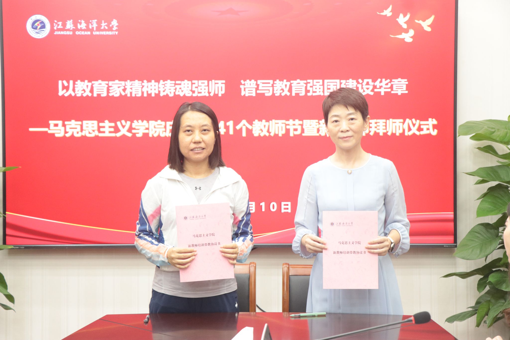 随后,“新教师拜师仪式”在庄重而温馨的氛围中有序进行。指导老师与新教师共同签署培养协议,明确了传帮带的责任与期望。新教师们向各自的指导老师敬献鲜花,表达了对前辈的崇高敬意和潜心学习、快速成长的决心。赵霞老师作为指导老师代表发言,承诺将毫无保留、倾囊相授,助力新教师成长。新教师代表许默涵在发言中表达了对学院和指导老师的感谢,并表示将虚心求教、勤勉工作,尽快完成角色转换,争做一名合格的高校思政课教师。